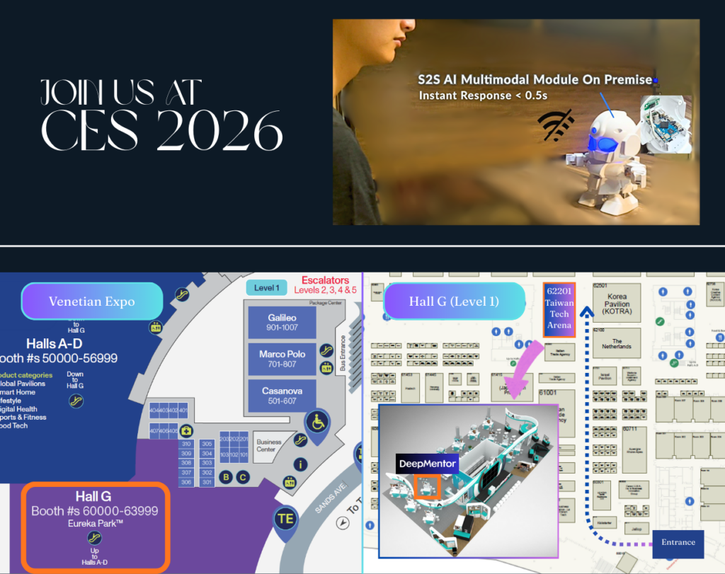 We are thrilled to announce that DeepMentor Inc. will be showcasing our cutting-edge AI technologies at CES 2026, held from January 6–9 in Las Vegas! Visit us at Venetian Expo, Hall G, Booth 62201, and experience our latest realtime speech-to-speech multimodal edge AI IP.